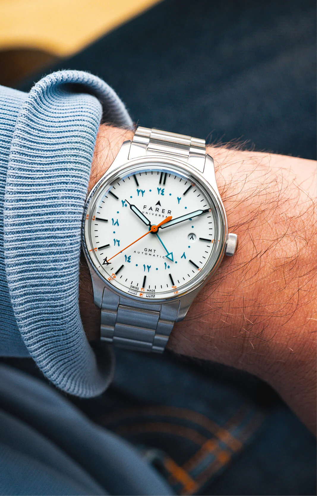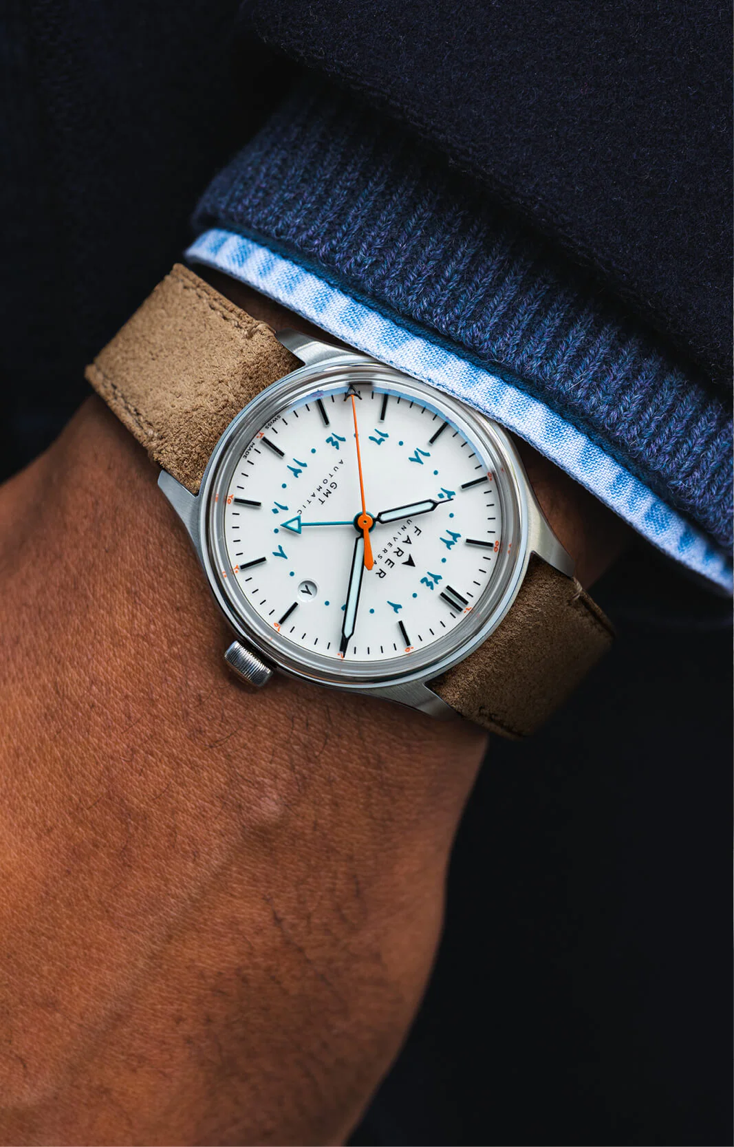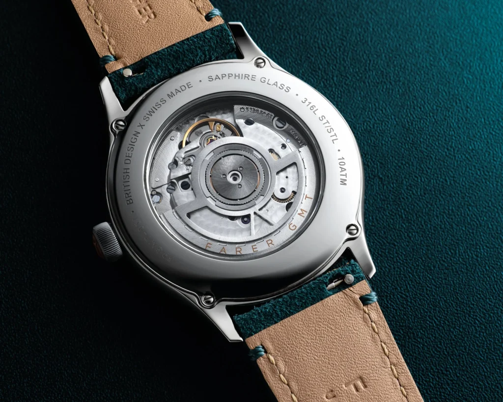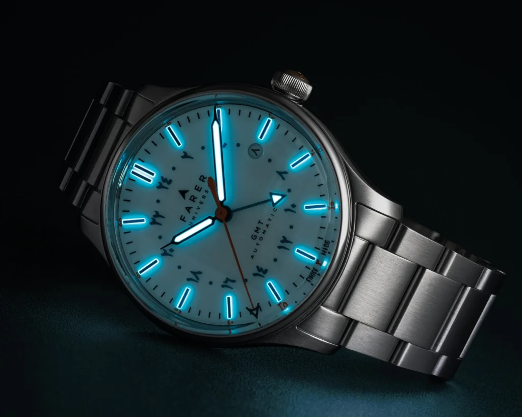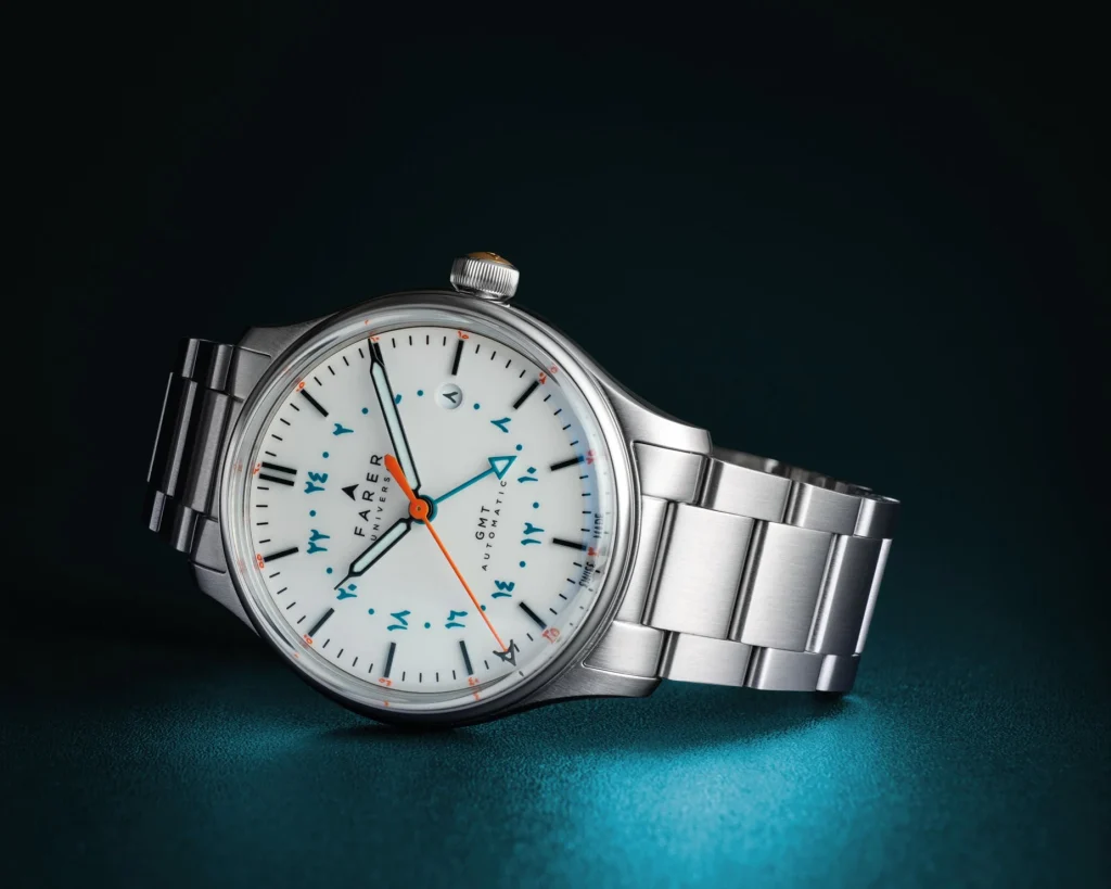The black syringe handset, also filled with ice-blue Super-LumiNova, contrasts beautifully with the teal of the 24-hour GMT hand and scale, ensuring the second time zone can be picked out instantaneously. A final, vibrant flourish is provided by the orange seconds hand, tipped with the distinctive Farer ‘A,’ a nod to the brand’s enduring identity.
