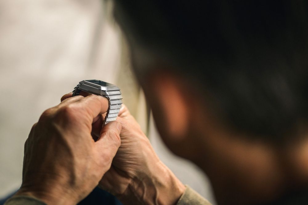 Built like a monolithic sculpture, the case features a tiered, layered construction that plays brilliantly with ambient light. The alternating satin-finished surfaces and sharply polished angles give the watch a three-dimensional presence that feels carved directly from a single block of steel rather than assembled.