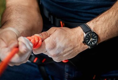 To keep the watch secure during high-intensity pursuits, it is fitted to a Carbon Black FKM rubber strap with orange contrast stitching, which mimics the look of high-end sailcloth but offers the supreme comfort and durability of modern rubber.