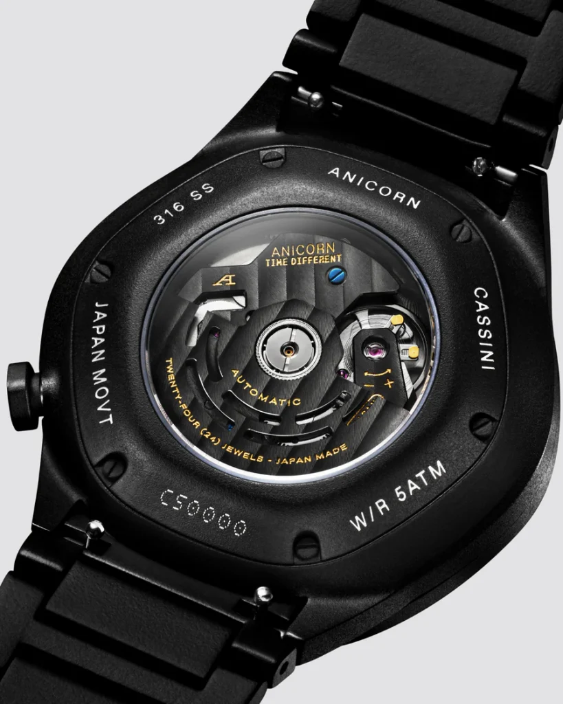 However, the true heart of the Cassini Nemesis is revealed through its exhibition caseback. Anicorn has gone to great lengths to ensure the movement is as unique as the exterior. The modified NH35-ATD automatic movement features a bespoke anthracite bridge and rotor, finished in a striking gunmetal grey.