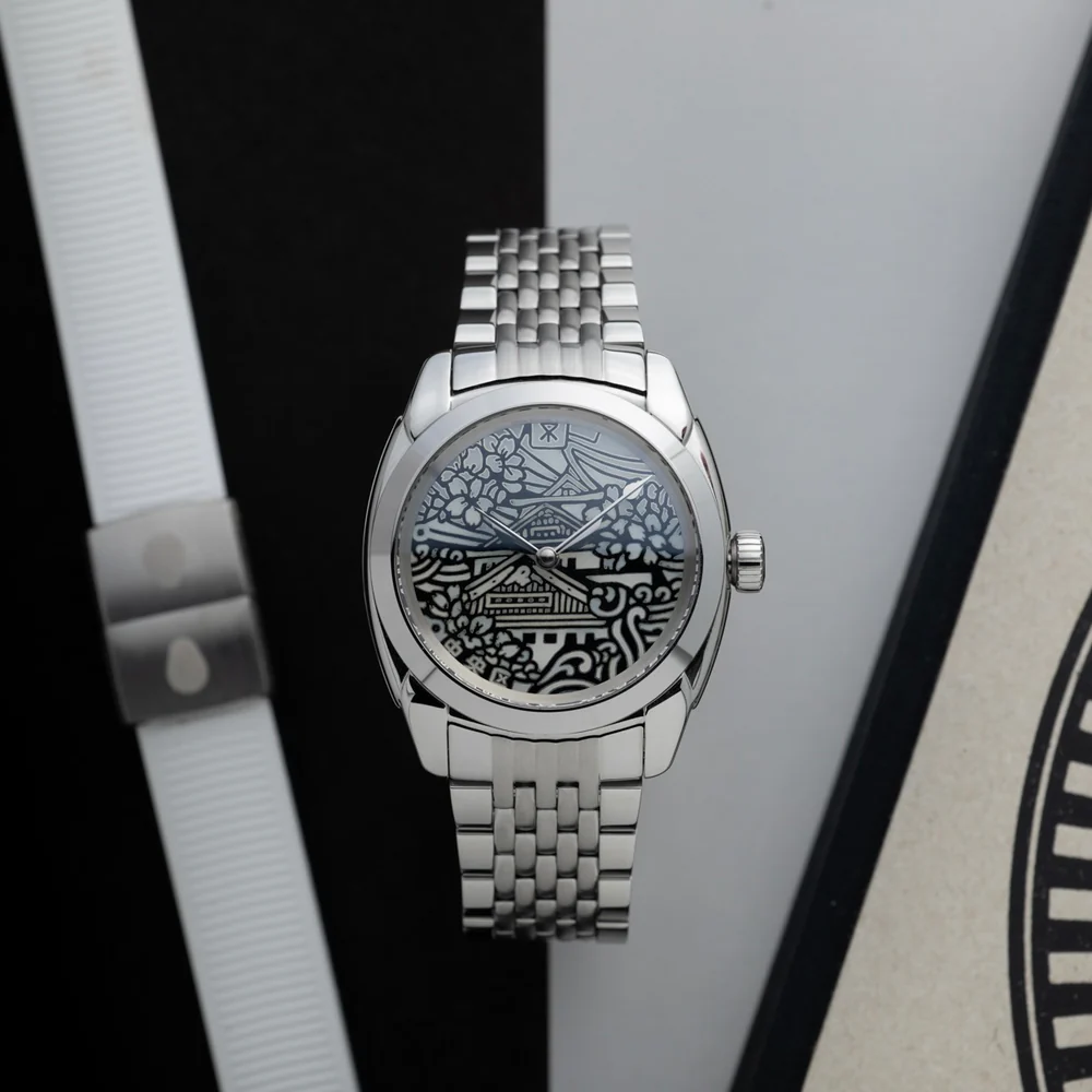 The undisputed masterpiece of this watch is its vibrant dial, which perfectly depicts an official municipal cover from Osaka. At its center sits the iconic Osaka Castle, framed by flowing water and cherry blossoms in full bloom.