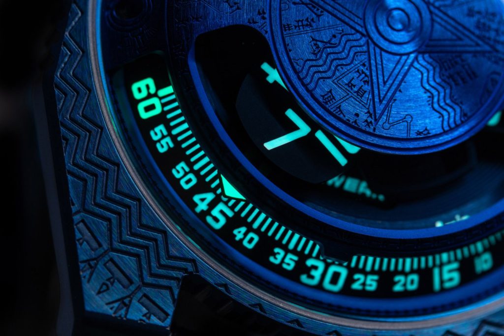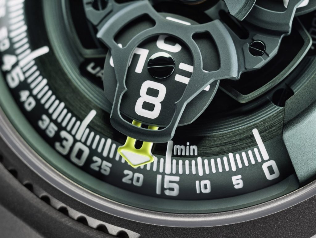 The kinematic structure is distributed across three highly stable ARCAP alloy baseplates, supporting aluminium hour satellites mounted on beryllium bronze Geneva crosses. True to URWERK’s industrial aesthetic, the finishing is highly purposeful rather than purely ornamental, featuring crisp circular graining, sandblasting, and circular satin finishes, alongside generous applications of Super-LumiNova® for low-light legibility.