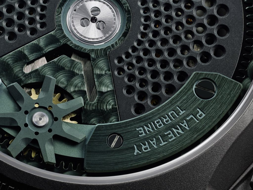 The automatic winding is smartly regulated by URWERK’s signature Windfänger system, a unique air-resistance turbine that controls winding efficiency to prevent excessive energy input and wear.