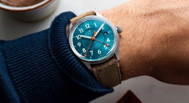 The centrepiece of the Lander IV GMT is its triple-stepped dial, a sea-green dream with a sunburst finish that catches the light in a captivating dance of iridescence. The date window is perfectly matched to the dial’s hue, maintaining a harmonious design. Crisp white Arabic numerals, printed with 14 layers of Super-LumiNova for enhanced visibility, pair beautifully with the silver syringe handset. A burnt orange seconds hand tipped with the Farer logo adds a dash of contrast, while the bright red GMT hand makes tracking a second-time zone effortless, utilizing a 24-hour scale on the outer edge of the dial.