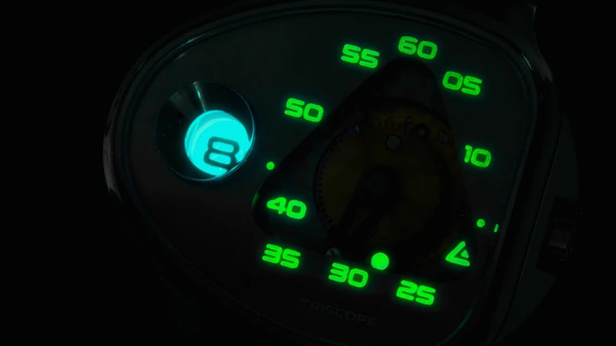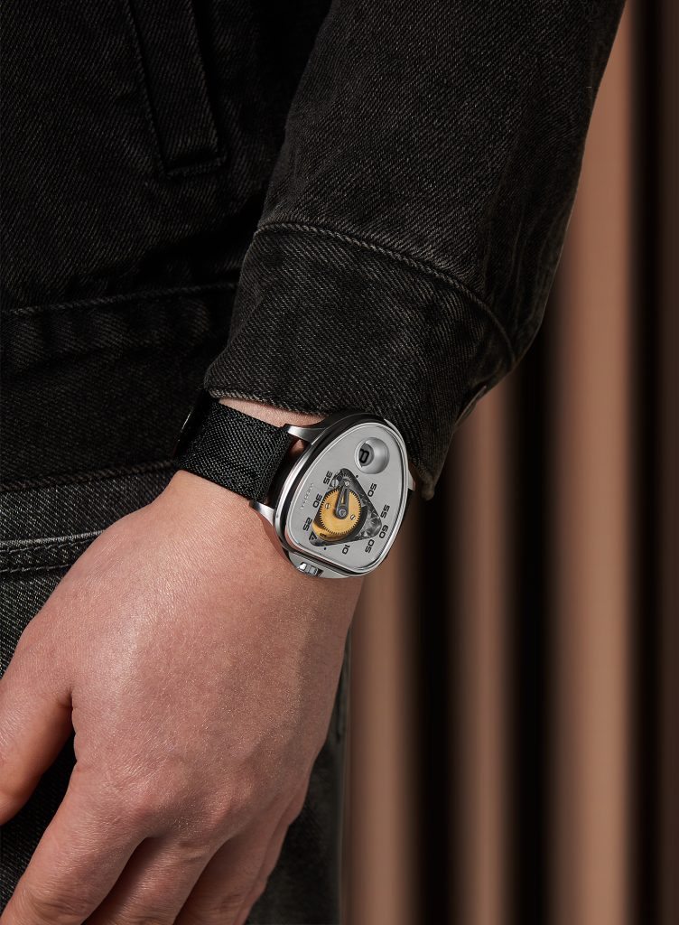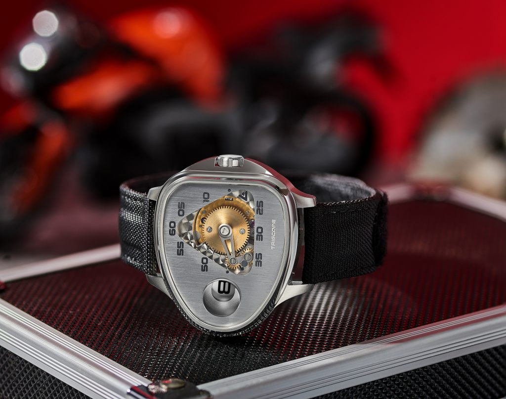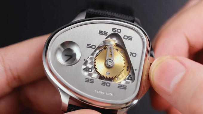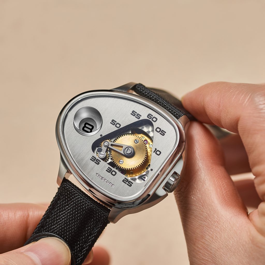 At the heart of the Triscope’s allure is its silhouette. The case does not follow the standard circular or rectangular archetypes; instead, it takes the form of a Reuleaux triangle. This softened, three-sided shape creates a dynamic, futuristic profile that feels organic yet decidedly engineered.