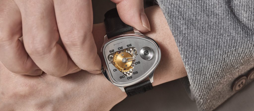 The minutes are displayed with equal ingenuity. There is no central hand rotating in a circle. Instead, the minute hand follows a recessed track along the dial’s own triangular path. This is driven by an exposed brass ratchet wheel which turns the minute indicator lever. To ensure precision, Angles has added a dot to the end of this lever, which slides tightly against the triangular opening to offer fast, accurate legibility.