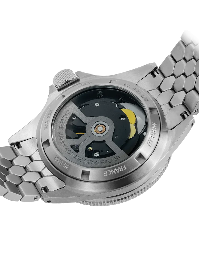 Turning the timepiece over reveals a detail that will deeply delight horological purists. Through the sapphire exhibition caseback—which remarkably does not compromise the watch’s formidable 30 BAR (300m) water resistance—you are treated to an unobstructed view of the proprietary YEMA Manufacture CMM.11 caliber.