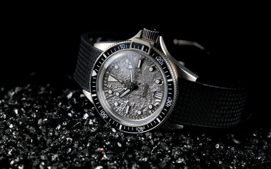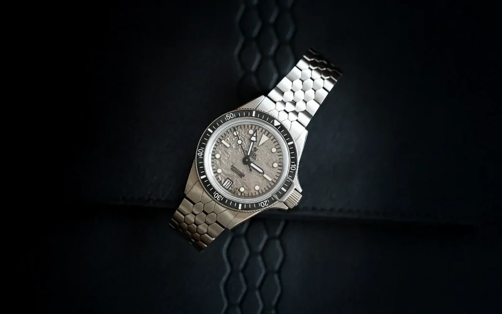 The absolute star of the show, however, is the dial. Seeking to directly replicate the stark, mineral surface of the moon, YEMA utilized a highly specialized oil-press technique over a sandblasted titanium base. The result is a subtle, cratered relief that plays with ambient light exactly like moonlight reflecting over the open sea.