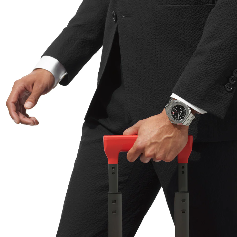 Powering this traveler’s companion is the BR-CAL.325 automatic mechanical movement. Visible through the sapphire crystal case back, the movement features a 360° oscillating weight, a mesmerizing mechanical detail that mirrors the rotation of a jet engine turbine.