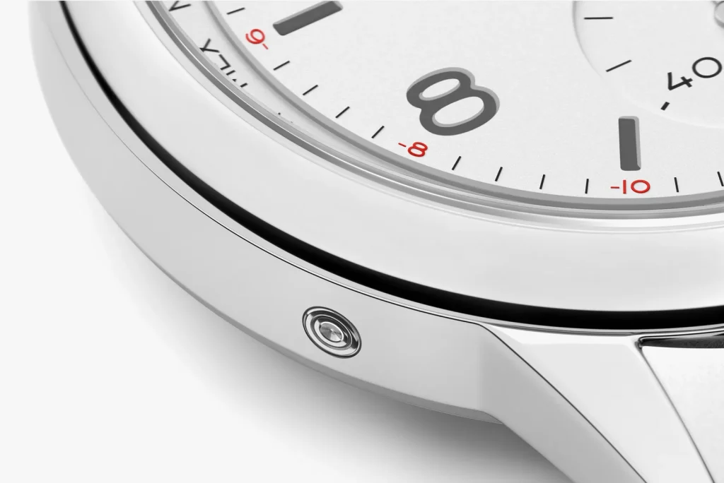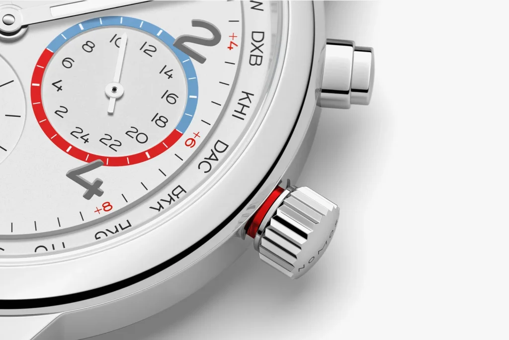 To break up the monochrome aesthetic, the designers implemented a few highly strategic flashes of color: tiny red numerals dotting the outer edge of the main dial, a sharp red marker to highlight the local time, and a matching red outer ring on the home time subdial at 3 o’clock.