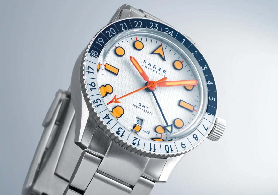 The immediate captivation of the Maze Blue GMT (£1325) lies in its daring and dynamic colour palette. A white dial, subtly textured with a honeycomb pattern, serves as the canvas for a symphony of vibrant hues. Fluorescent orange hour and minute hands, filled with amber X1 Super-LumiNova, leap forth with immediate legibility, their bold presence further accentuated by a burnt orange seconds hand, tipped with Farer’s signature ‘A’. The navy blue GMT hand, equally luminescent, adds a crucial layer of functionality while contributing to the watch’s striking visual depth.