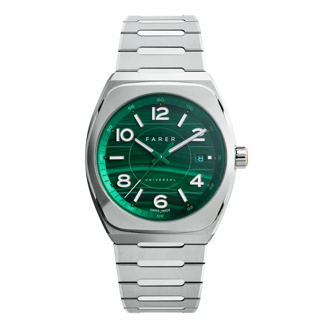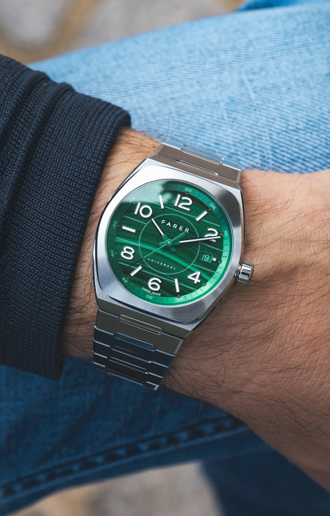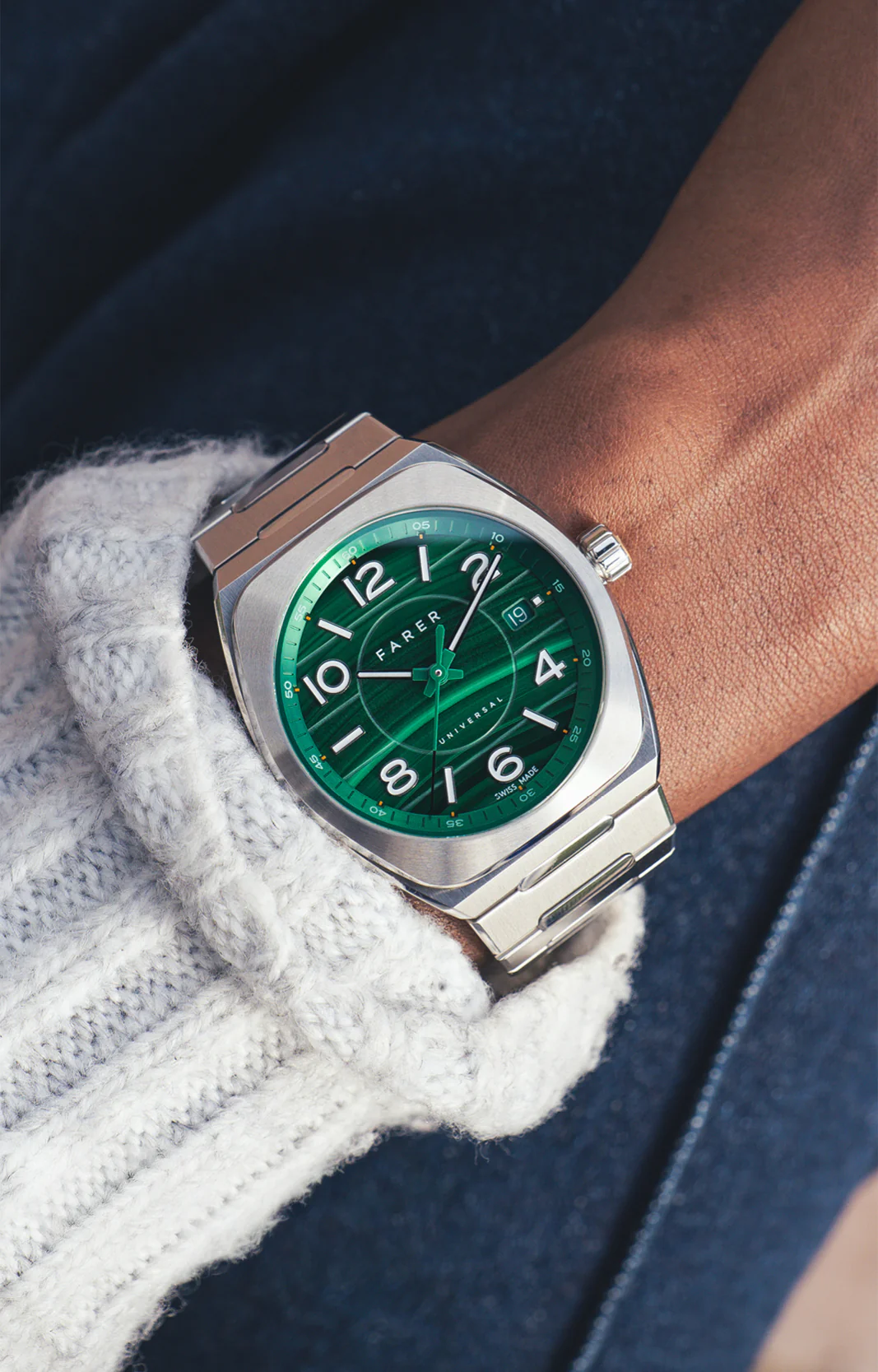 The undisputed protagonist of the Viridis—Latin for “green”—is its mesmerizing dial. Farer has eschewed traditional lacquers and enamels in favor of genuine malachite. Cut from a single piece of this vibrant gemstone, each dial is a unique geological fingerprint, boasting its own entrancing ribbon patterns of light and dark veridian.