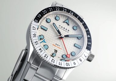 A printed light blue minute track encircles the dial, while the silver seconds hand is tipped with a bright blue Farer ‘A’. The GMT hand is presented in a bold “postbox red” with X1 Super-LumiNova infill, easily distinguishable for tracking a second time zone. This is done in conjunction with the bidirectional 24-click rotating bezel, which features a sapphire insert protecting the 24-hour scale underneath. The watch is topped with a boxed sapphire crystal with internal anti-reflective coating, adding a touch of vintage character while ensuring modern durability and clarity.