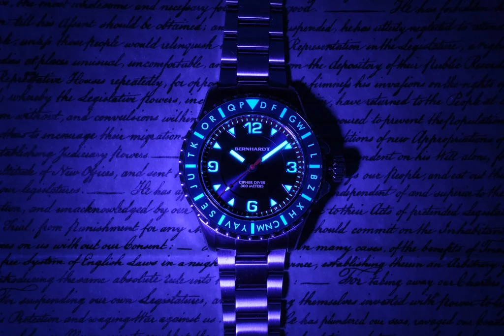 However, the true soul of this watch lies hidden beneath its sapphire bezel. Using a patent-pending system, Bernhardt has printed a full alphabet in UV-reactive ink that remains completely invisible under normal lighting conditions. It is only when the wearer illuminates the bezel with the included UV torch that the “invisible ink” reveals itself, transforming the 120-click unidirectional bezel into a functional mechanical encryption device.