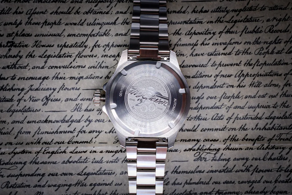 The caseback is elegantly engraved with the official Monticello 250th Anniversary emblem, marking it as a true collector’s piece for the sestercentennial. It is a watch for those who appreciate that history is not just something to be read, but something to be worn, solved, and carried into the future.