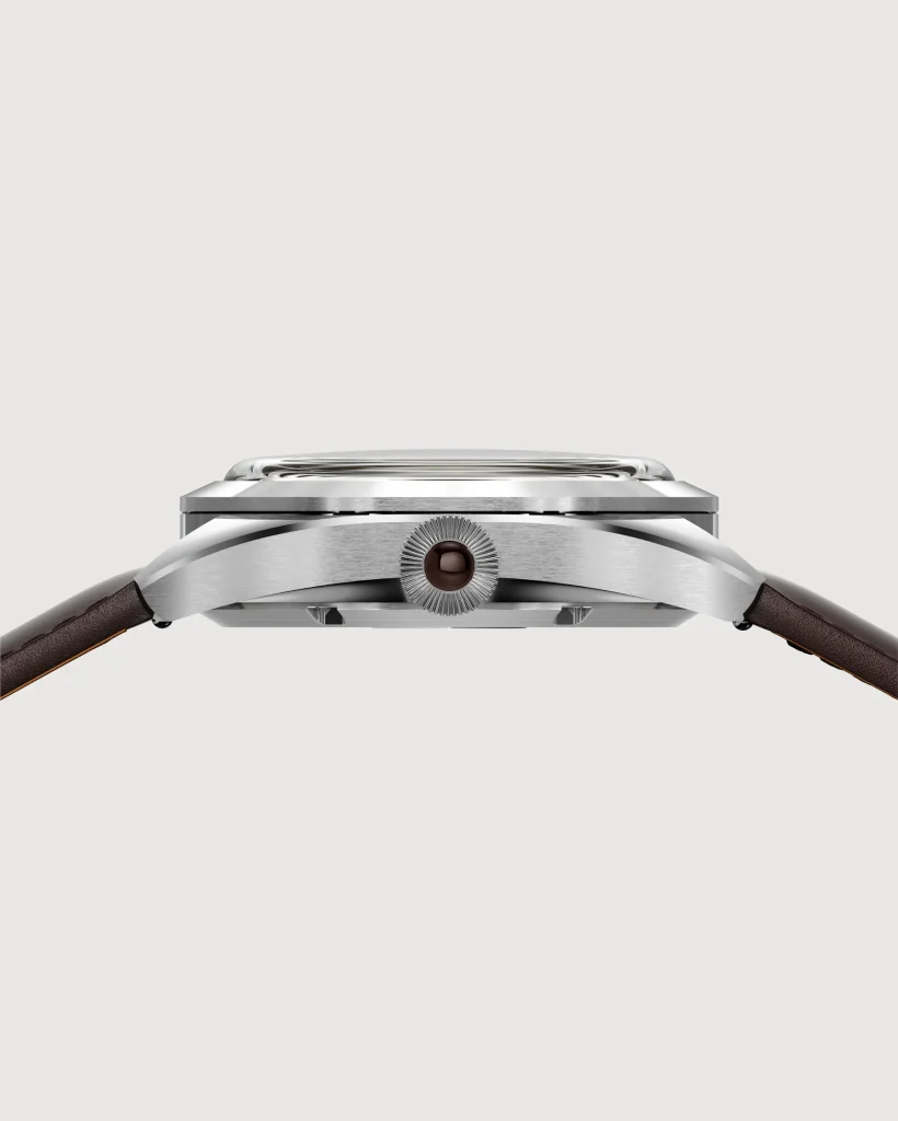 At first glance, the watch is a study in mid-century restraint. The 316L stainless steel case features a distinctive C-shape profile, measuring a classic 37.5mm in diameter. It sits on the wrist with the quiet confidence of a vintage Rolex Bubbleback or a sector-dial Longines, referencing the past without descending into pastiche. The dial itself is the protagonist here—a smoked-salmon colored lacquer that evokes the warm, amber glow of a lounge at midnight.
