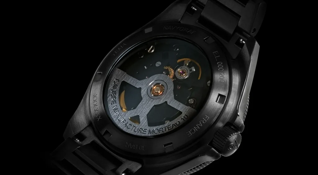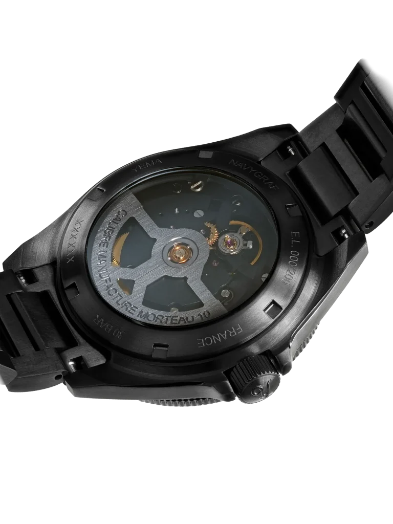 Impressively, integrating this crystal display does not compromise the watch’s serious professional credentials. The Navygraf maintains a rock-solid 30 BAR (300 meters) depth rating, bolstered by a robust, solid IP black screw-down crown that features the brand’s embossed logo.