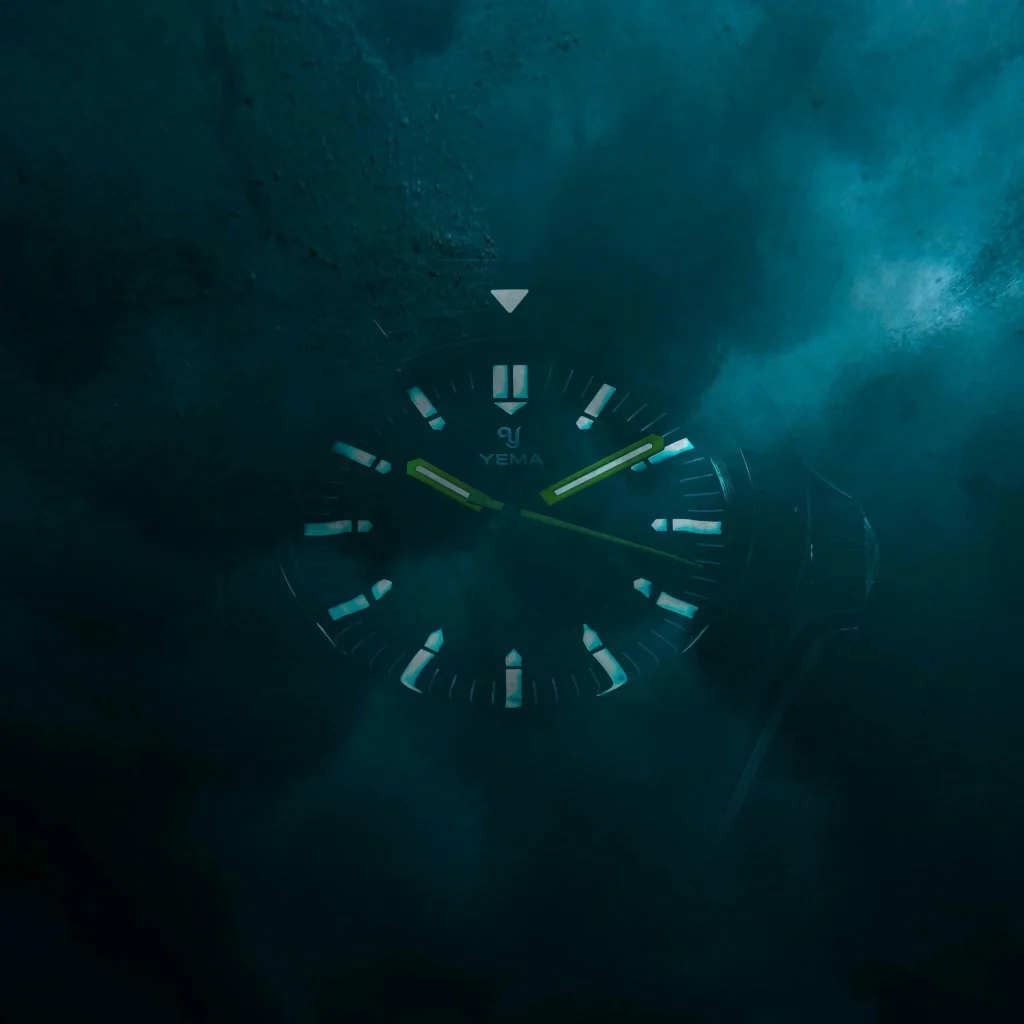These striking hands are framed by Yema’s iconic “exclamation point” hour markers, printed in a warm, vintage-leaning beige. When the ambient light fades away completely, these markers, along with the hands and the bezel’s 12 o’clock triangular pip, glow fiercely thanks to a generous application of Grade A Super-LumiNova.