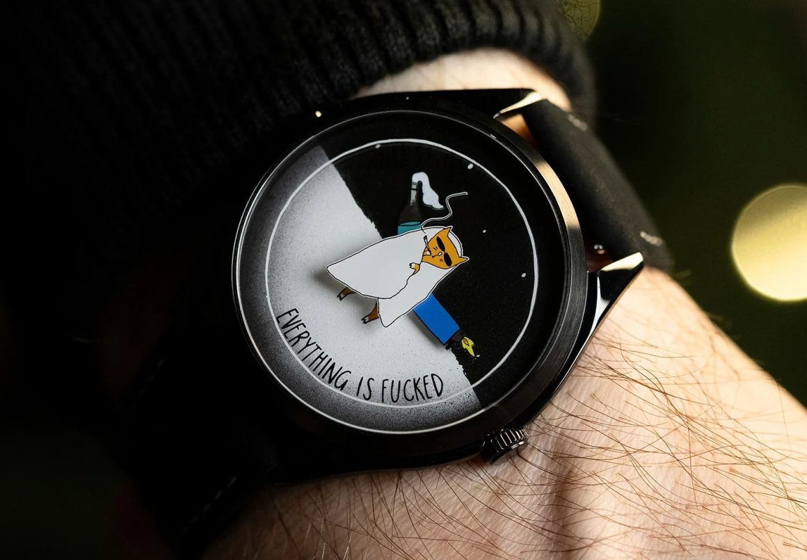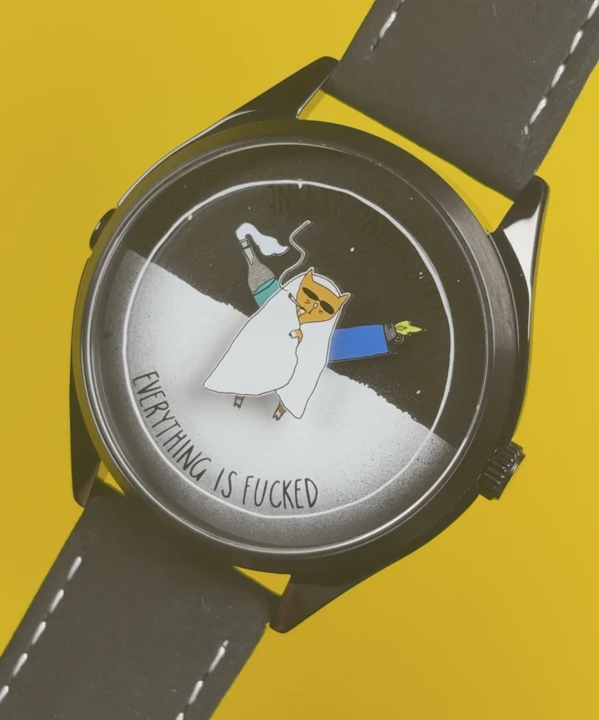 As the seconds tick by, the watch face alternates between two contrasting mantras: “everything is fine” and “everything is fucked.” It is a brilliant, mechanical representation of the fine line we all walk between keeping it together and watching it all fall apart.