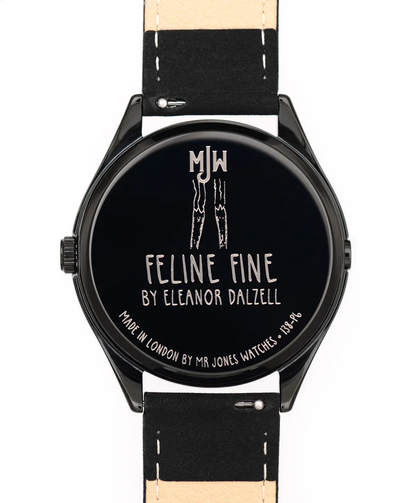 The medium, unisex-sized case is paired with an 18mm black suede strap adorned with contrast white stitching, providing a tactile softness that balances the sharp edge of the dial’s message. Powered by a reliable single-jewel quartz mechanism and backed by a 12-month warranty, the Feline Fine is a robust piece of wearable art.
