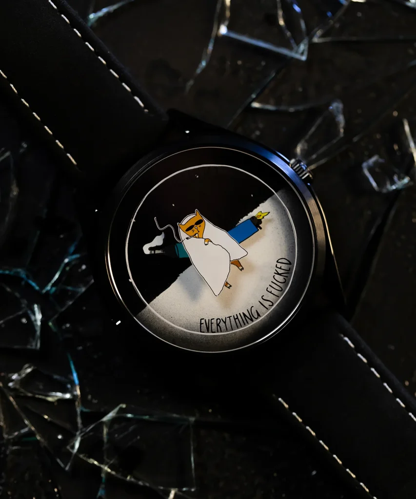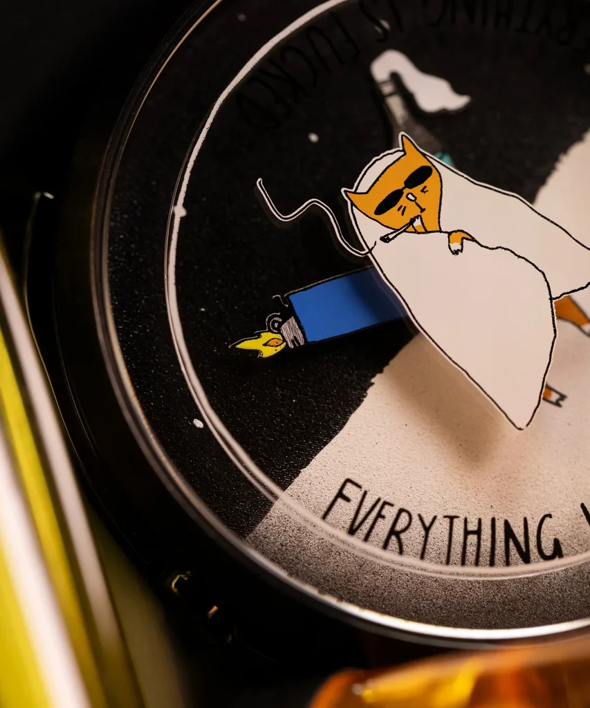 Designed by the talented illustrator Eleanor Dalzell, the Feline Fine features a central character that encapsulates the modern zeitgeist: a sunglass-wearing, cigarette-smoking cat draped in a literal blanket of indifference. The dial is a kinetic playground of contemporary anxiety and defiant optimism.