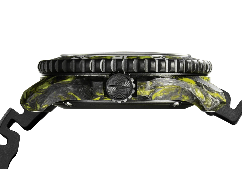 The standout feature is undoubtedly the case. Under intense heat and pressure, liquidated carbon fibre is melded with an innovative lime green luminescent resin. The result of this unpredictable forging process is a marbled case that is materially and visually unique; like the Aurora Borealis itself, no two watches share the exact same pattern, ensuring every owner possesses a true one-of-a-kind instrument.