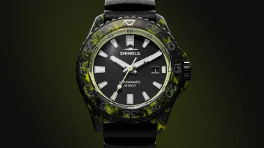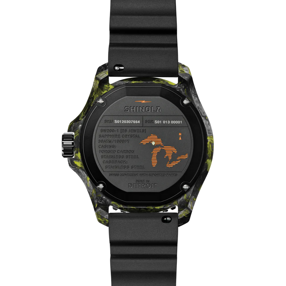 The attention to detail extends to the caseback, which features a combination of forged carbon and stainless steel etched with Shinola’s signature Great Lakes artwork, including a marker for the Presque Isle Dark Sky Park—a further tribute to celestial wonders and the deep, wild nature of America’s northern territories.