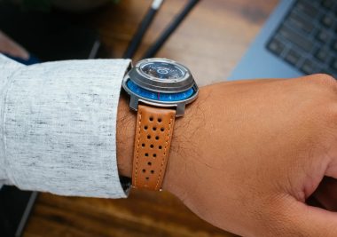 The Xeric Invertor II Automatic Tan Blue Watch ($750) is a timepiece for those who appreciate a unique blend of innovation and classic watchmaking. With its design inspired by retro driving watches, it offers a distinctive visual experience by showcasing the rotor at the top of the dial while also featuring a side viewing window for timekeeping. This fusion of aesthetics and function makes the Invertor II an eye-catching accessory for any luxury watch collection.